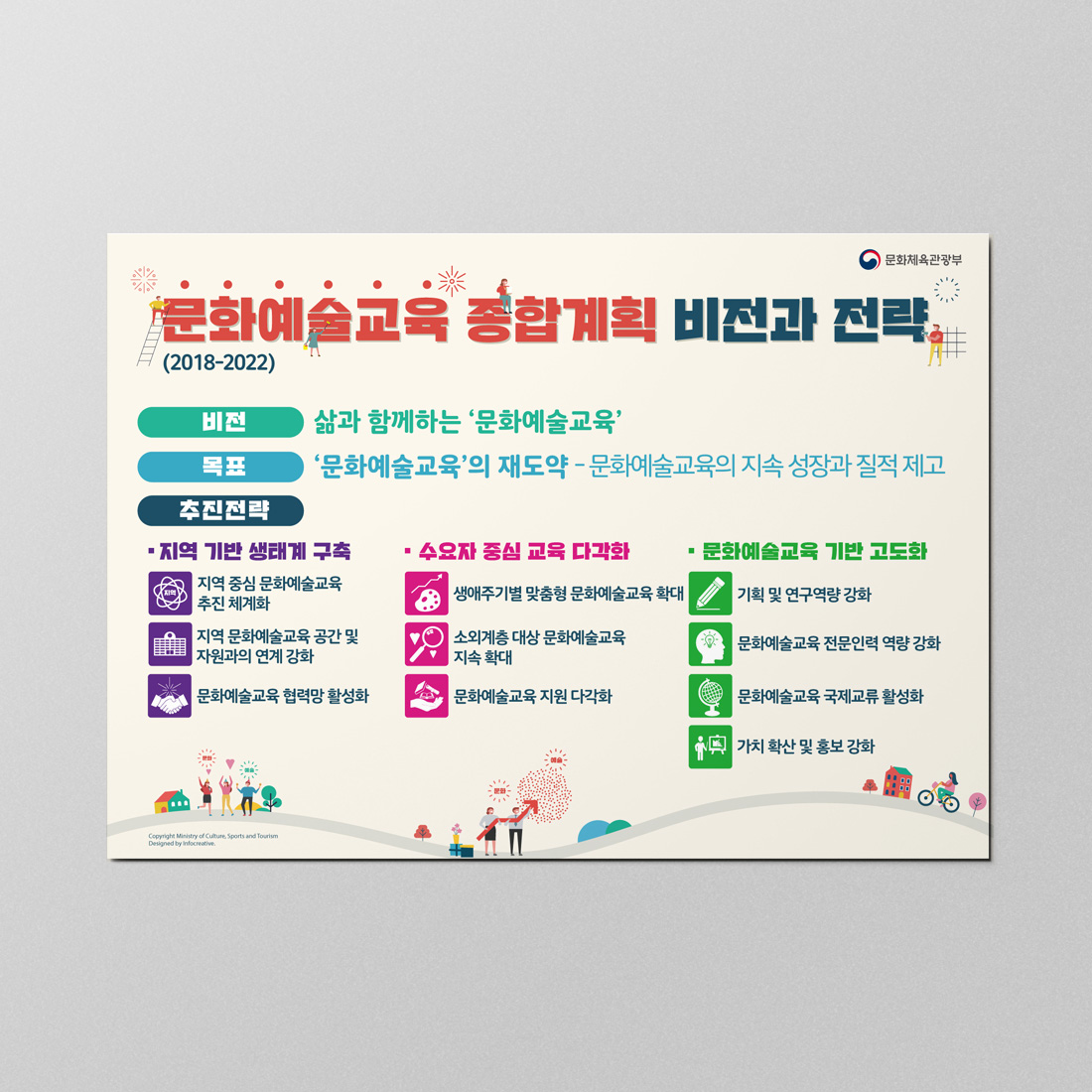 Continue Reading[vc_row][vc_column][vc_column_text]본 디자인은 문화예술교육 종합 계획과 비전 및 전략에 관한 방대한 정보를 4페이지로 압축하여 디자인한 인포그래픽입니다. 각각의 파트들은 연상되는 이미지 등으로 구성하였으며, 문화예술이 연상되는 아기자기 한 스타일의 디자인을 추구하였습니다.[/vc_column_text][/vc_column][/vc_row]...