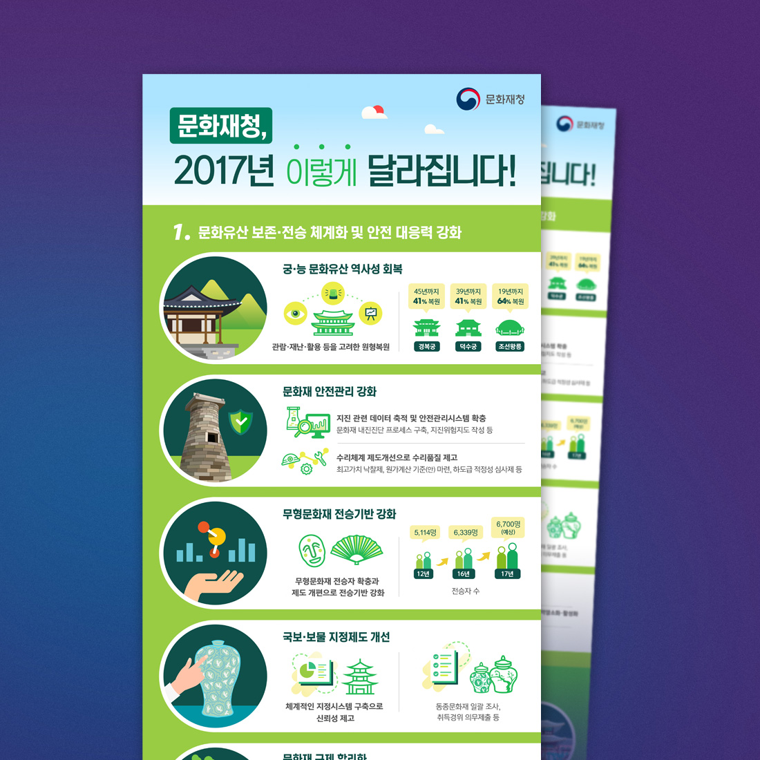 Continue Reading[vc_row][vc_column][vc_column_text]본 디자인은 2017년 달라지는 문화재청의 다양한 업무 및 정책을 한눈에 요약한 인포그래픽입니다. 주요 카테고리별로 일러스트레이션 및 픽토그램을 적용하여 구성하였습니다.[/vc_column_text][/vc_column][/vc_row]...