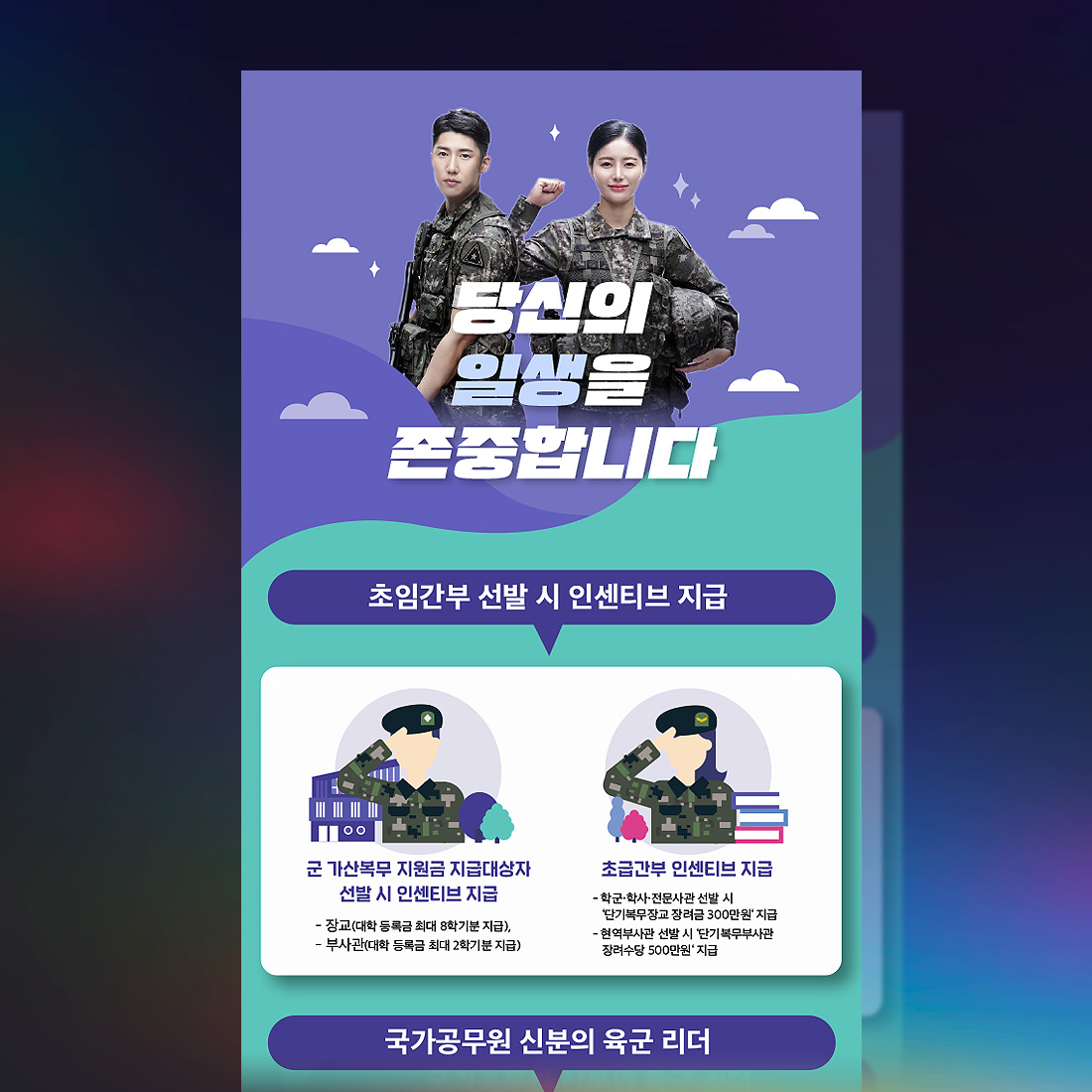 [vc_row][vc_column][vc_column_text]본 콘텐츠는 육군간부의 멋과 매력에 대한 모션 및 영상 콘텐츠로서 대한민국 육군 최초이자 3군 최초로 시도한 프로젝트이며, 육군간부를 지원하고자 하는 젊은이들에게 육군간부의 다양한 정보를 전달한다. 본 콘텐츠는 시리즈로 제작되었으며, 콘텐츠 아이덴티티, 철학, 메시지, 디자인 스타일링 등을 체계화하여 제작하였으며, 모션그래픽 외 인포그래픽, 카드뉴스 등 디지털 콘텐츠 Full-Set으로 제작된 최초의 사례이다. 본 콘텐츠는 직업군인(육군간부)이 받을 수 있는 급여에 대한 내용을 다루고 있다.[/vc_column_text][/vc_column][/vc_row]...