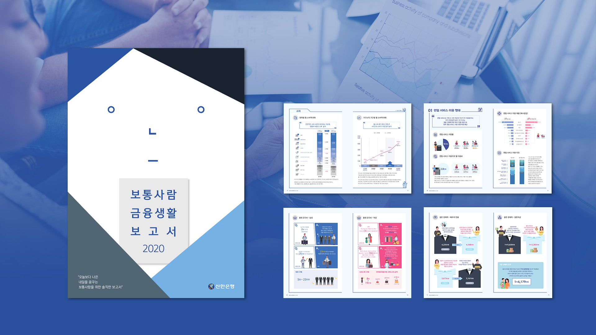 본, 디자인은 나이스D&R (리서치)가 수집한 신한은행 빅데이터를 기반으로 고객의 소비패턴과 동향 등을 쉽고 간결하게 인포그래픽 화한 브로슈어입니다. 신한은행의 아이덴티티와 유의미한 수치를 중심으로 정보의 최종 소비자인 고객 관점 중심으로 디자인하였으며, 인포그래픽, 시각화, 일러스트레이션 등 고객의 이해를 돕기 위한 다양한 데이터 표현법을 구사하였습니다. 콘텐츠는 완성 이후 각종 언론 보도용 및 고객 배포용으로 활용되고 있습니다.