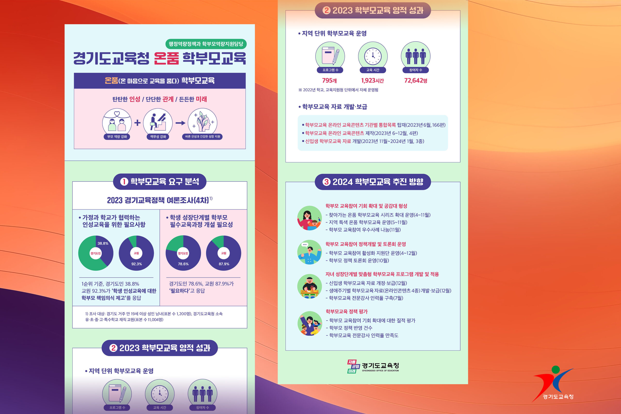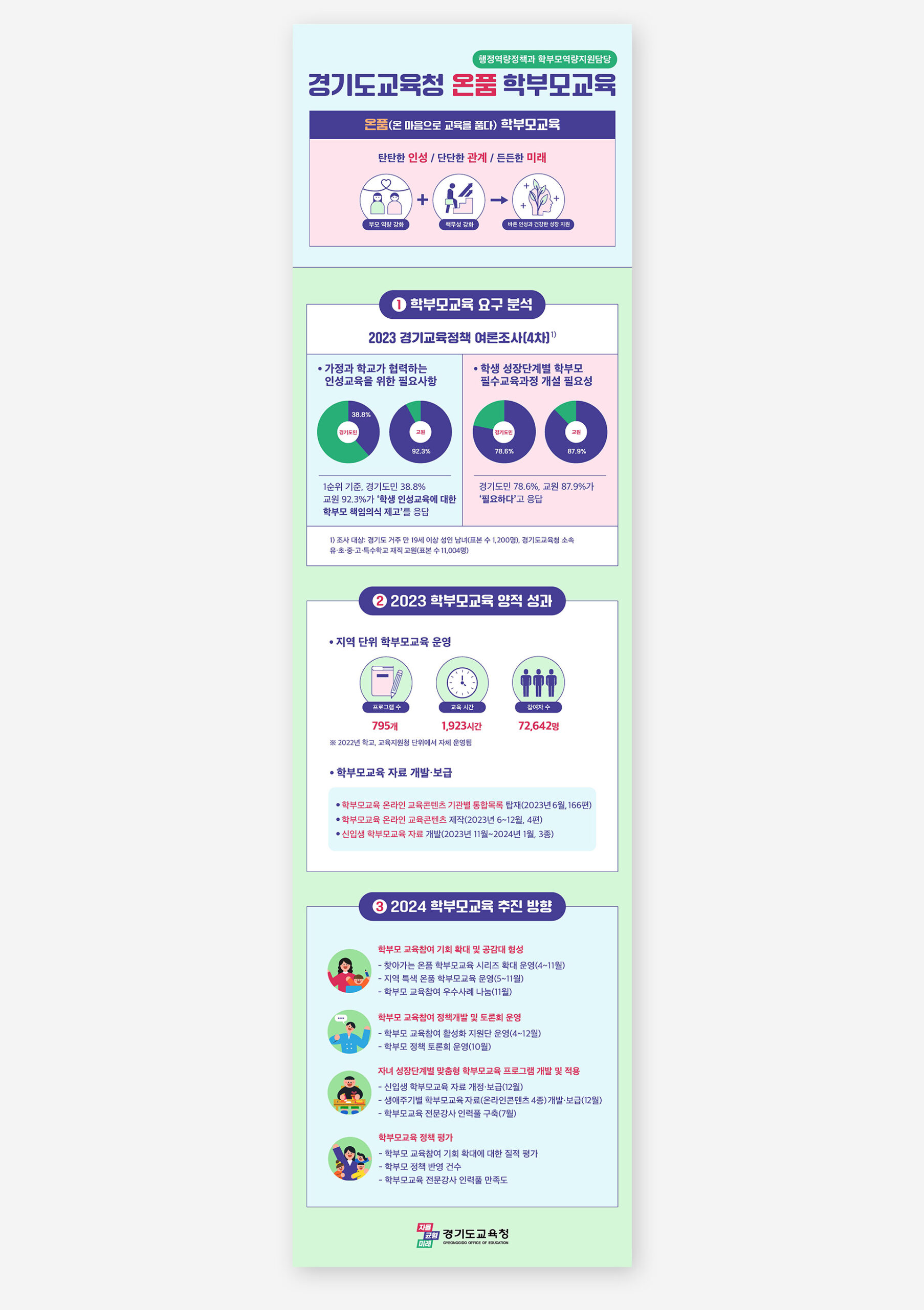 본 인포그래픽은 경기도 교육청의 23년 성과 분석을 통해, 24년의 추진 방향을 한눈에 알기 쉽게 표현한 인포그래픽으로서 데이터의 핵심 수치와 경기도 교육청의 정체성을 표현하는데 초점을 맞춘 인포그래픽입니다.