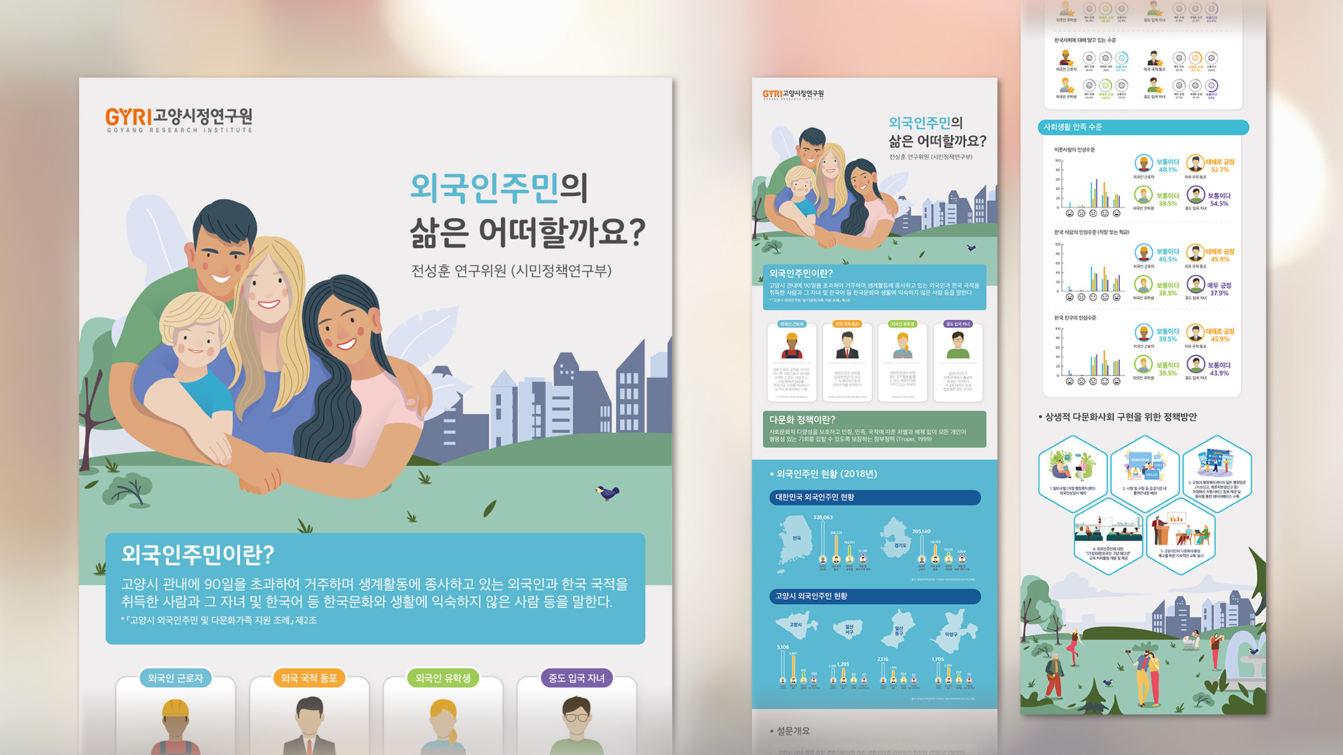 본 인포그래픽은 고양시에 거주하는 외국인 주민에 대한 통계 데이터를 인포그래픽화 한것으로 매우 방대한 데이터를 알기 쉽게 재구성하여 표현하였다.
