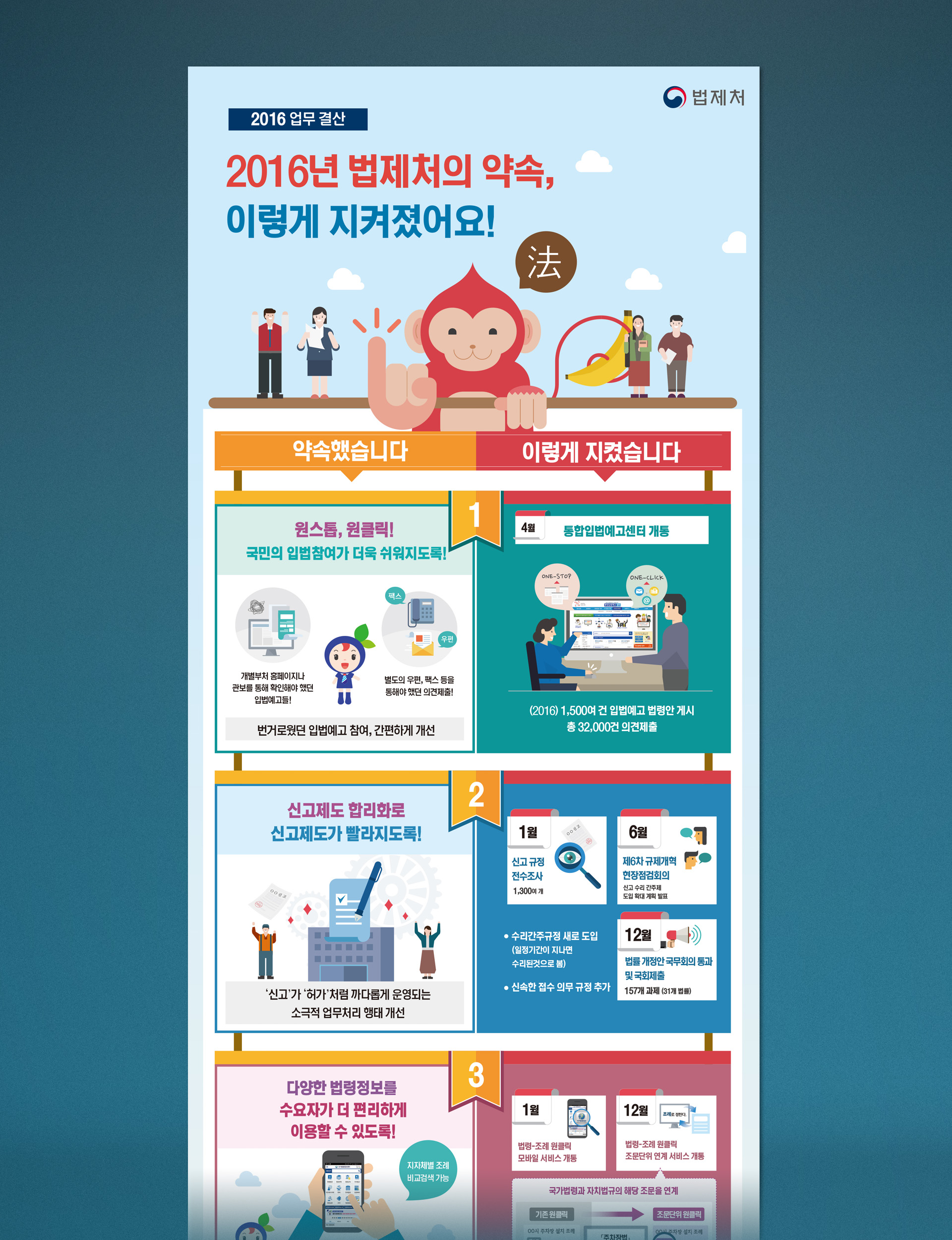 본 디자인은 2017 법제처의 업무계획 인포그래픽입니다. 법제처의 캐릭터적 요소를 활용하여 세부적인 정책들을 알기 쉽게 디자인 하였습니다.