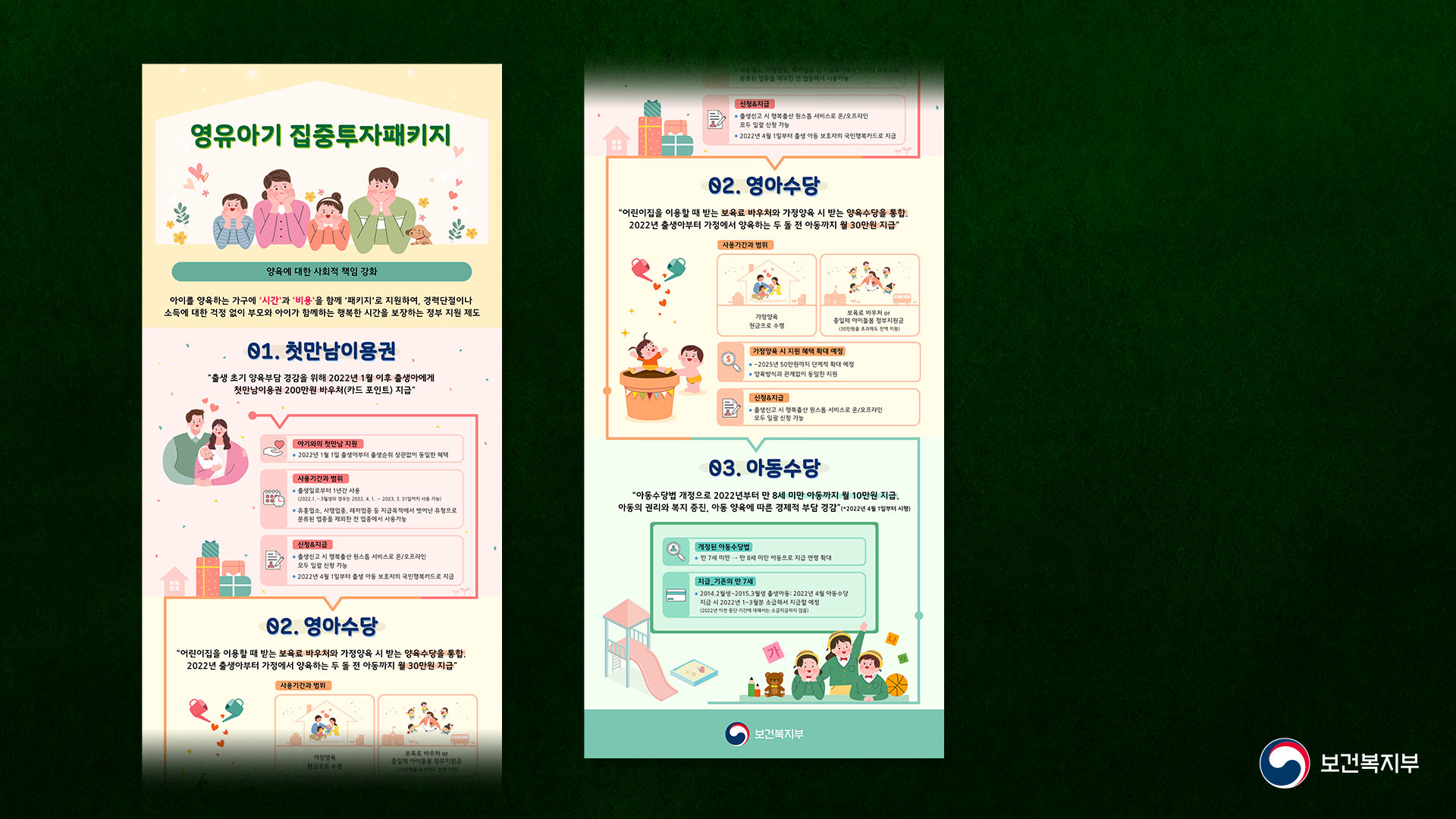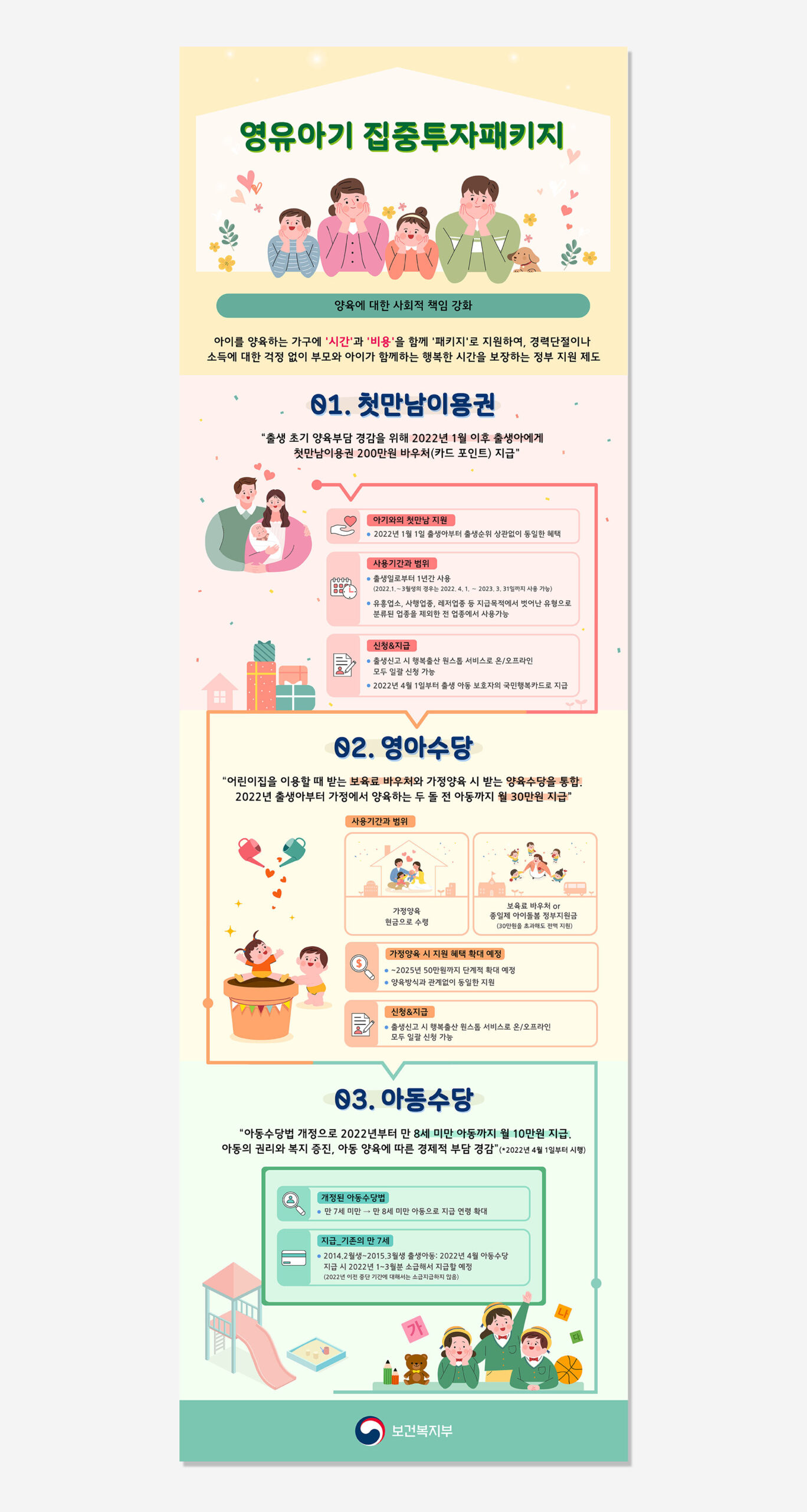 본 인포그래픽은 보건복지부에서 제공하는 영유아기 집중투자패키지에 대한 정책 인포그래픽이며, 국민들에게 지원되는 다양한 혜택을 3가지 카테고리로 나누어 구성한 디자인입니다.