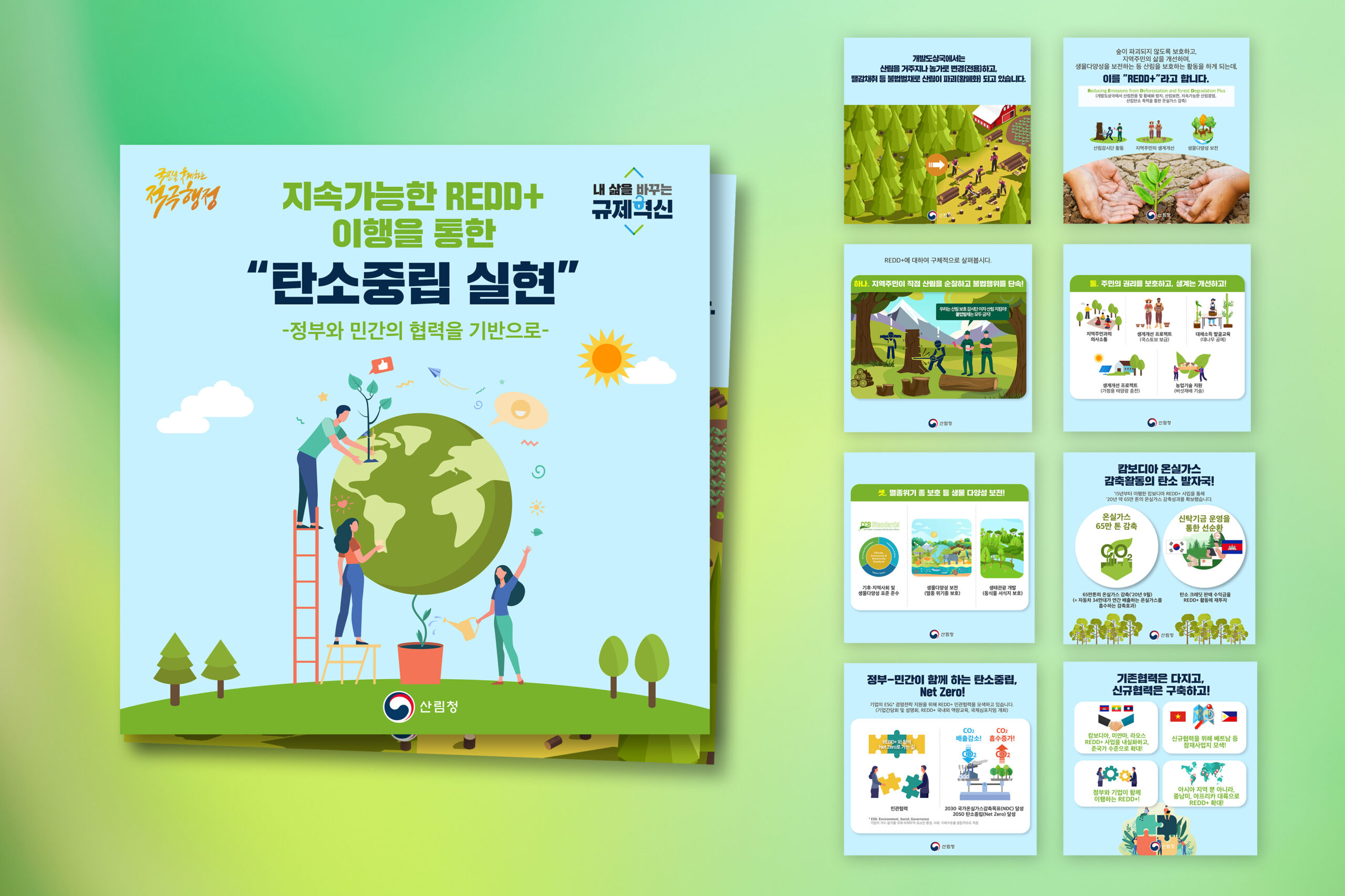 본 디자인은 탄소중립을 실현하는 REDD+에 관한 어렵고 복잡한 내용을 쉽게 구성한 카드뉴스 디자인입니다.