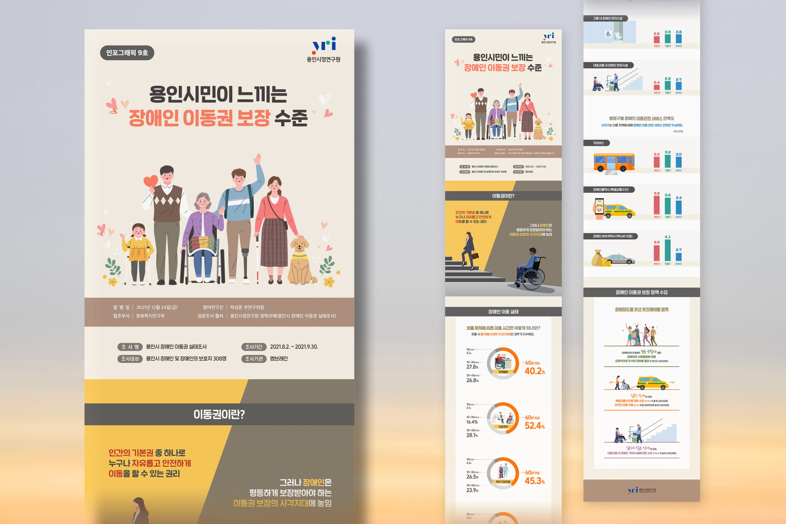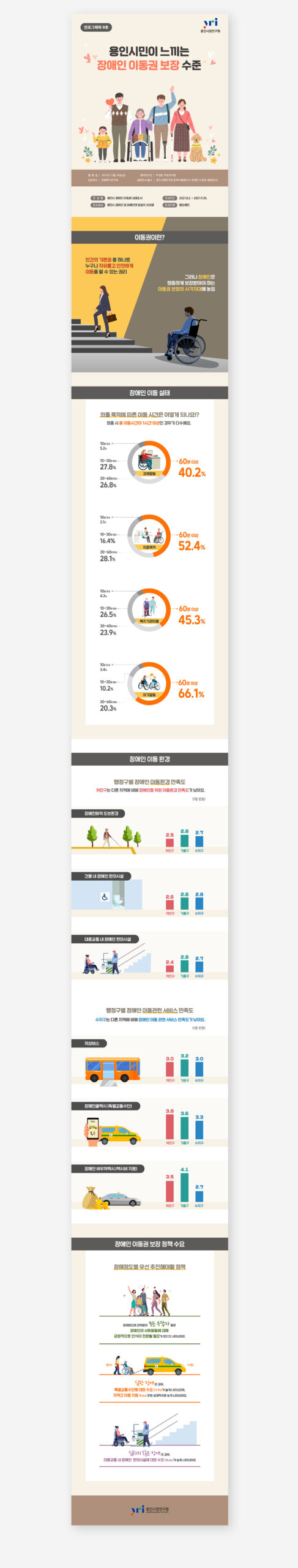 본 디자인은 용인시민이 느끼는 장애인의 이동권 보장 수준에 관한 통계를 인포그래픽화 한것으로 상황별로 다양한 정보를 보여주고 있습니다.