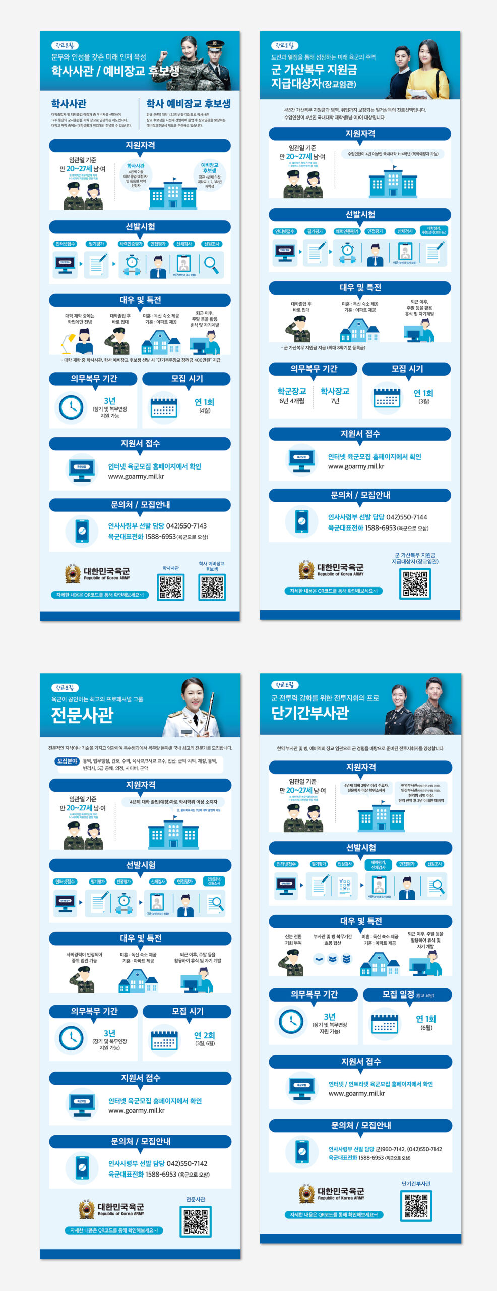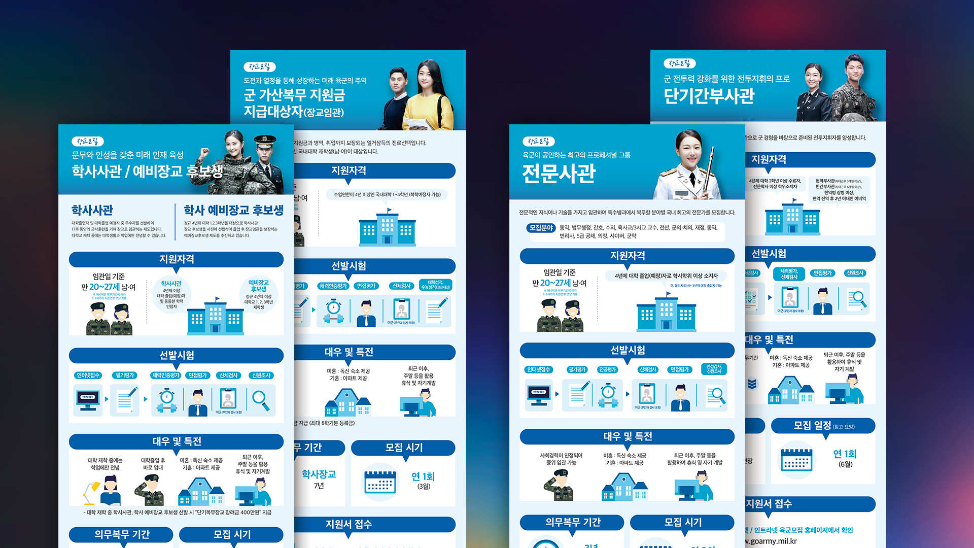 본 인포그래픽은 육군간부 중 장교 모집과정에 대해 쉽게 재구성한 인포그래픽이다. 기존의 모집과정은 일반적인 한글문서에 글 위주로 작성되어 다양한 모집과정의 방대한 내용을 한눈에 파악하기 힘들었지만, 금번 디지털 콘텐츠 체계화 프로젝트를 통해 모집과정을 장교, 부사관, 준사관, 군무원 등으로 구분하고 인포메이션 프레임워크도 재설정 후 체계화하여 제작한 것이 특징이다.