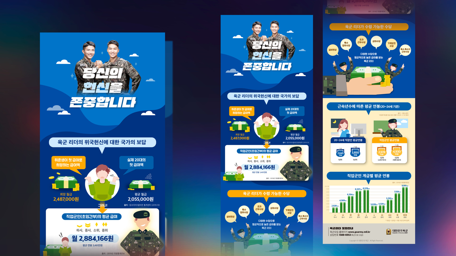 본 콘텐츠는 육군 간부가 받을 수 있는 급여에 관한 내용을 다루고 있는 인포그래픽으로 4가지 테마로 급여정보를 전달하고 있다.