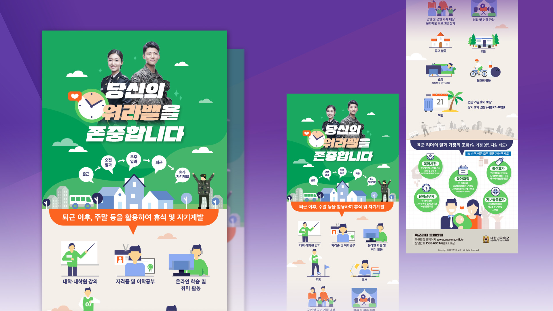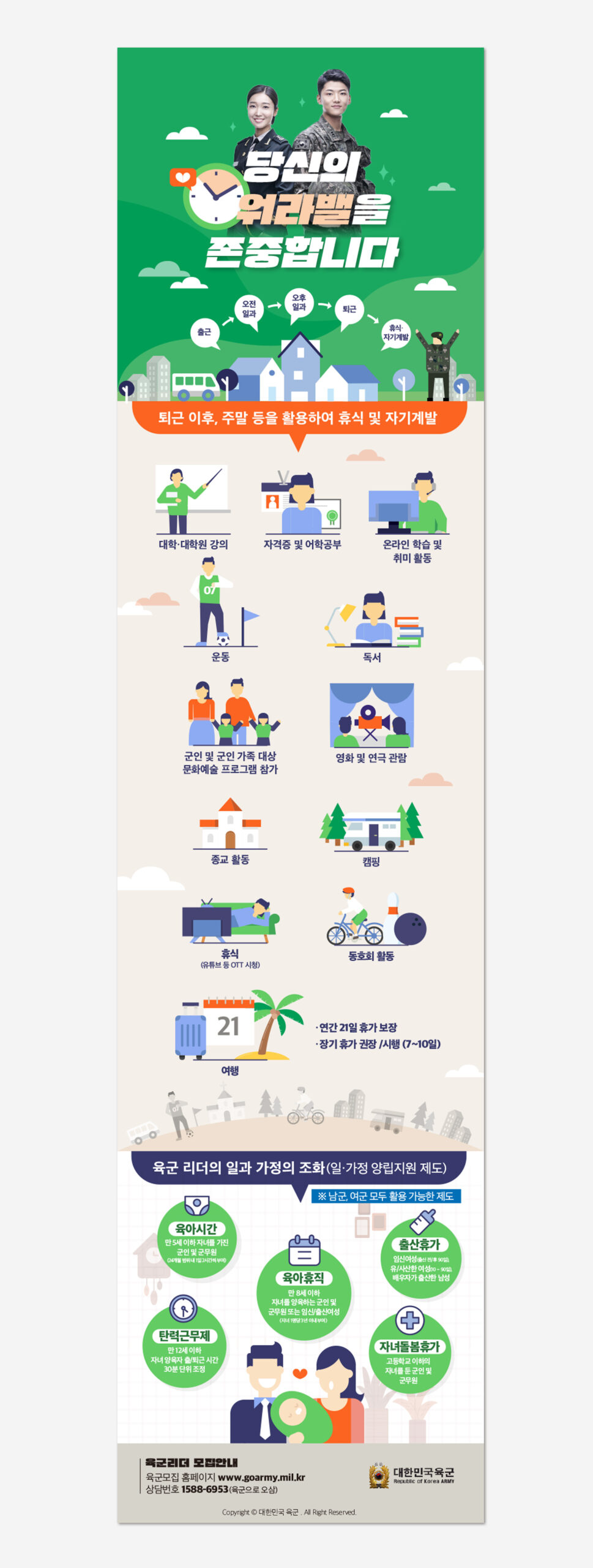 본 인포그래픽 콘텐츠는 육군 간부가 누릴 수 있는 워라밸을 표현한 인포그래픽으로 콘텐츠의 핵심 카피를 중심으로 다양한 혜택 정보를 다채롭게 전달하고 있다.