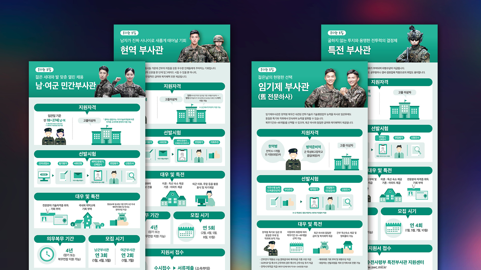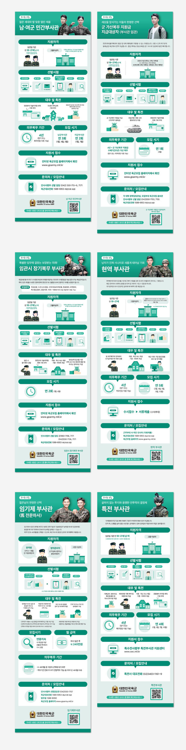 본 인포그래픽은 육군간부 중 부사관 모집과정에 대해 쉽게 재구성한 인포그래픽이다. 기존의 모집과정은 일반적인 한글문서에 글 위주로 작성되어 다양한 모집과정의 방대한 내용을 한눈에 파악하기 힘들었지만, 금번 디지털 콘텐츠 체계화 프로젝트를 통해 모집과정을 장교, 부사관, 준사관, 군무원 등으로 구분하고 인포메이션 프레임워크도 재설정 후 체계화하여 제작한 것이 특징이다.
