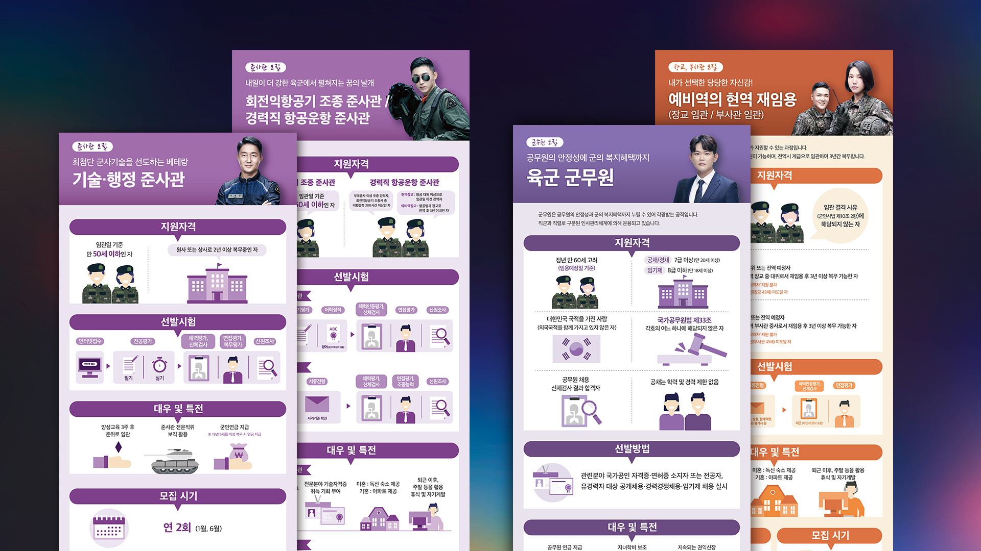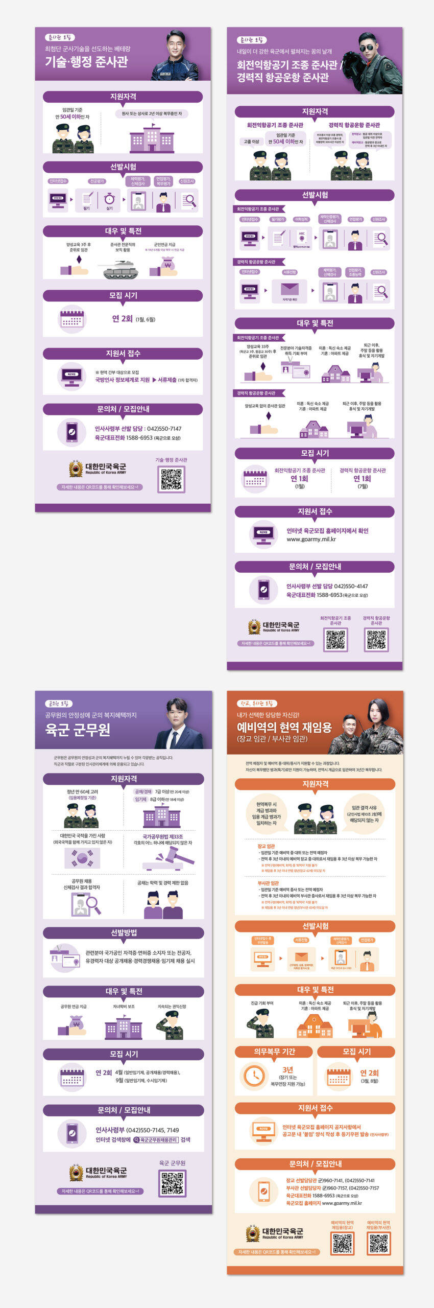 본 인포그래픽은 육군간부 중 준사관, 군무원 등의 모집과정에 대해 쉽게 재구성한 인포그래픽이다. 기존의 모집과정은 일반적인 한글문서에 글 위주로 작성되어 다양한 모집과정의 방대한 내용을 한눈에 파악하기 힘들었지만, 금번 디지털 콘텐츠 체계화 프로젝트를 통해 모집과정을 장교, 부사관, 준사관, 군무원 등으로 구분하고 인포메이션 프레임워크도 재설정 후 체계화하여 제작한 것이 특징이다.