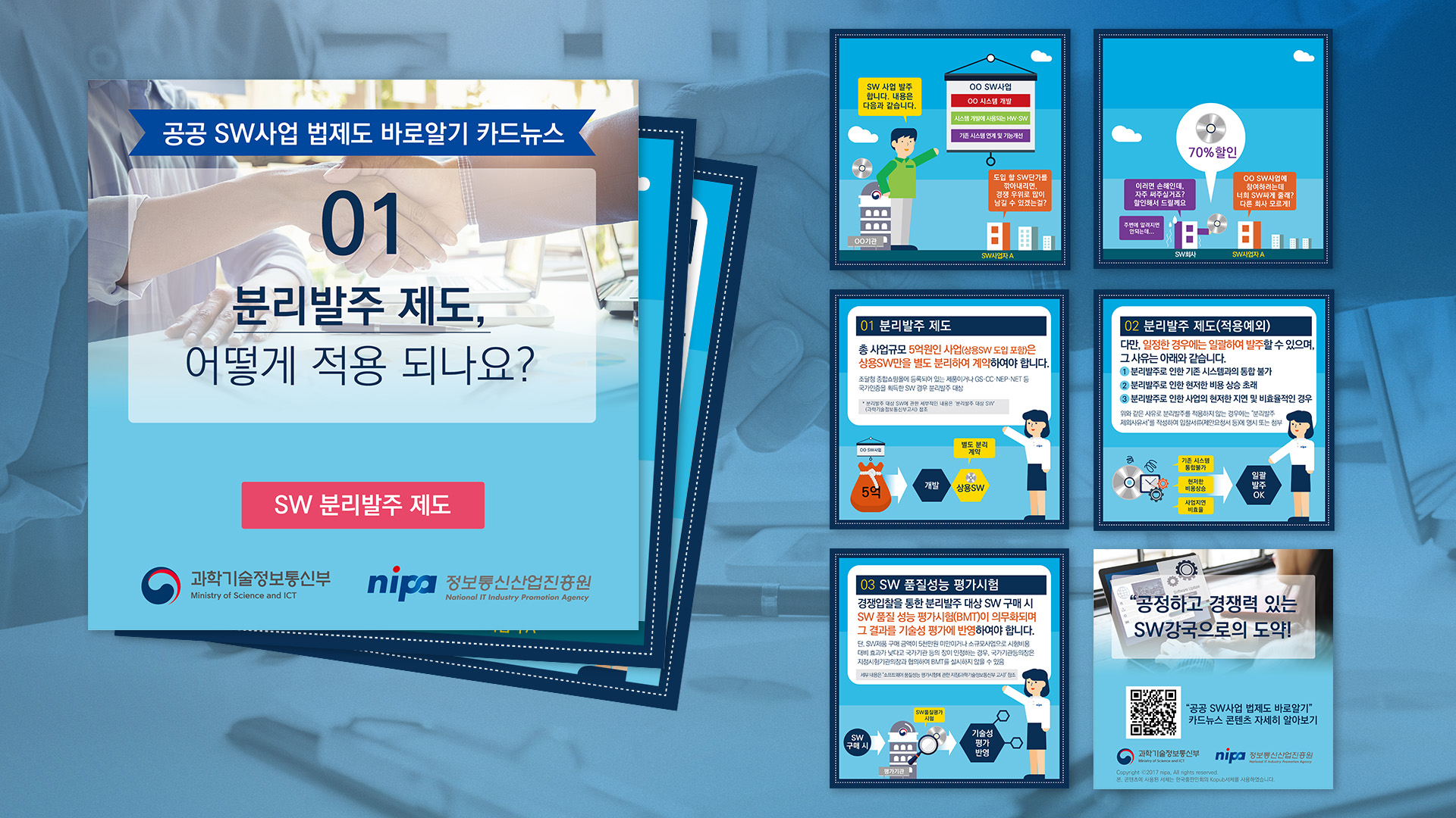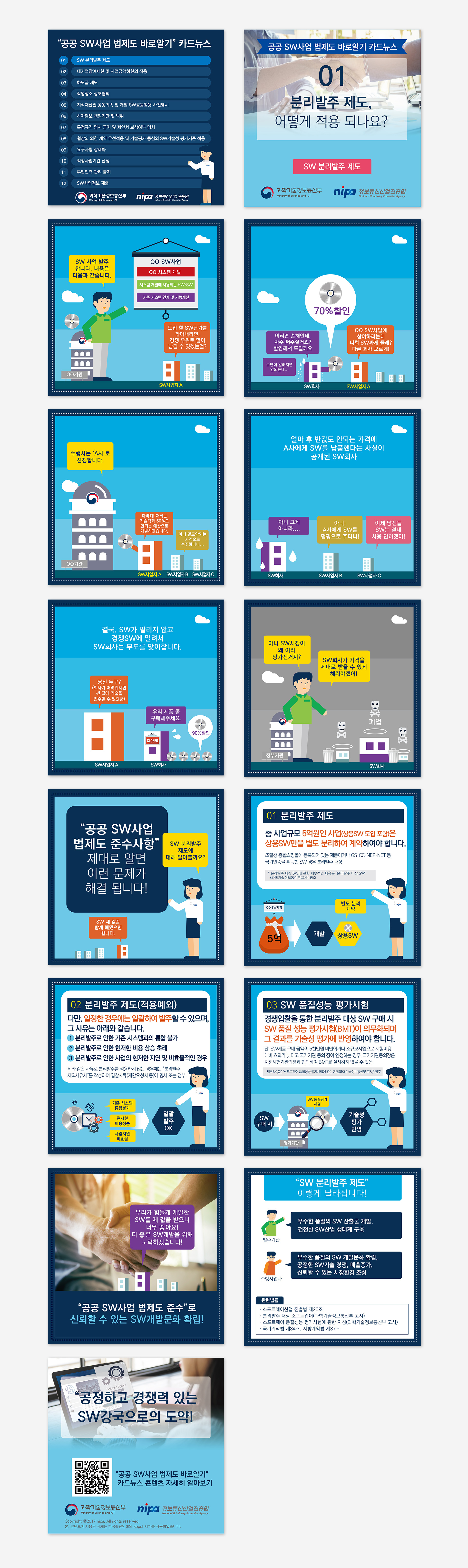 본 디자인은 일반인이 알기 어려운 공공 SW법제도에 관한 내용을 일반인도 친근하게 알 수 있도록, 사례를 기반으로 한 스토리텔링 카드뉴스 시리즈로서 정보통신산업진흥원의 콘텐츠 아이덴티티를 준수하여 제작하였습니다.