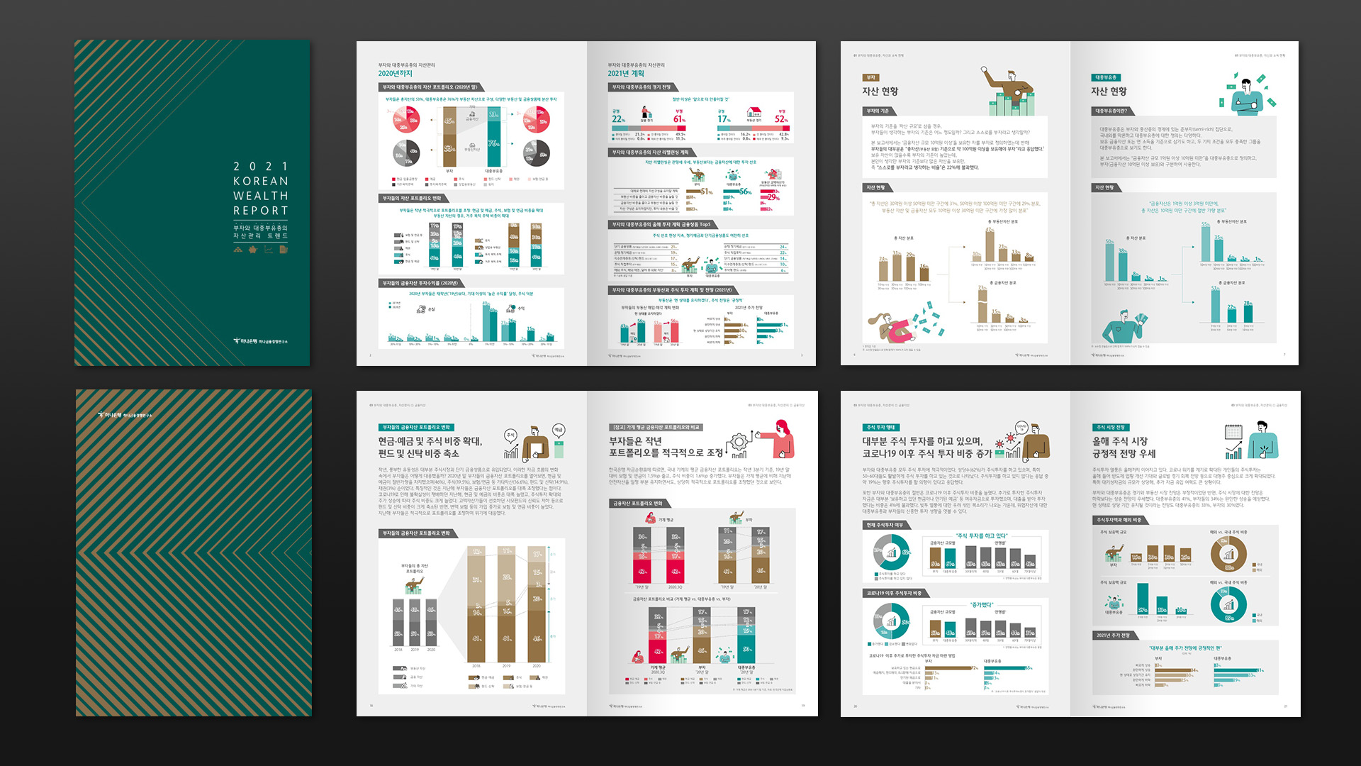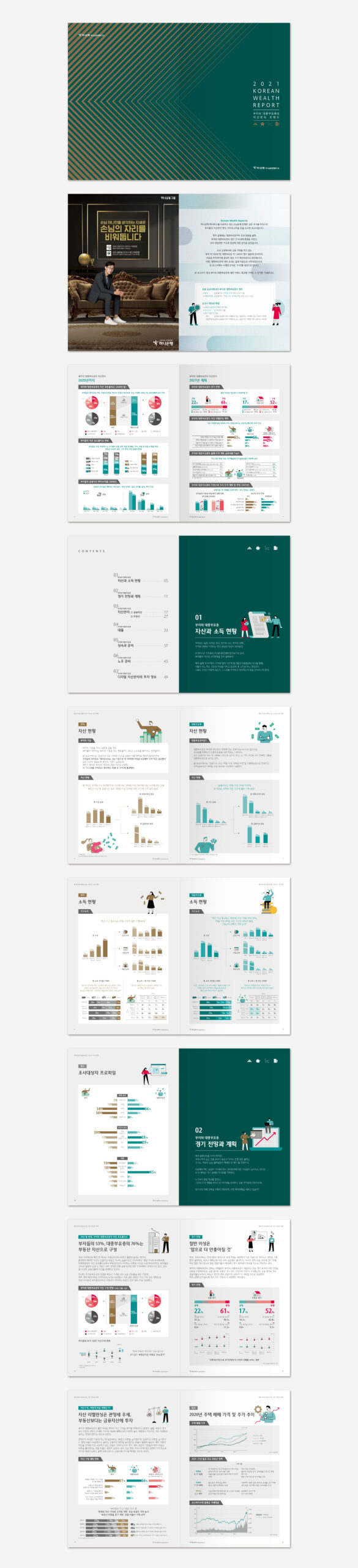 본 디자인은 하나은행 2021년 부자들과 일반인들의 행동특성 데이터를 인포그래픽으로 알기 쉽게 표현한 디자인입니다. 하나은행에서 최초로 시도한 과업이며 기존 워드, 엑셀 기반의 데이터를 일반인들이 알기 쉽도록 다양한 인포그래픽 기법 등을 활용하여 구성하였으며, 하나은행의 아이덴티티에 걸맞게 절제된 컬러와 디자인으로 세련되게 구성하였습니다. 본 결과물은 언론에서도 대대적으로 홍보되어 크게 주목을 받았으며, 여러 언론 매체 등에도 적극적으로 활용되었습니다.