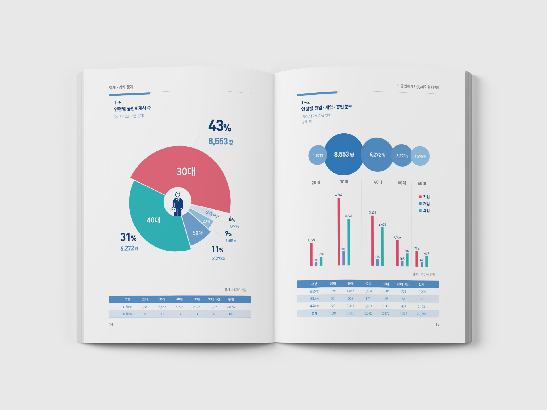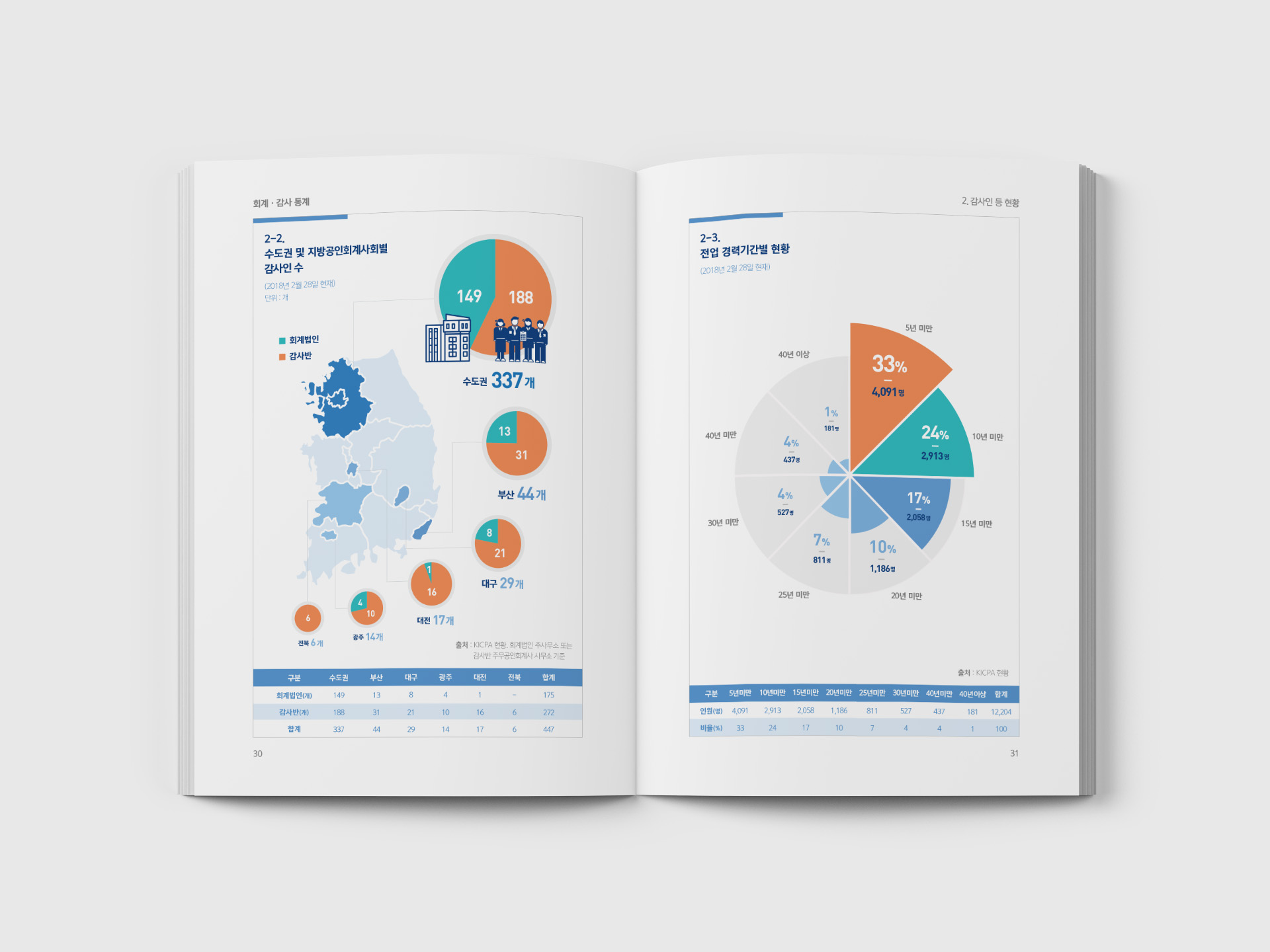 본 디자인은 2018년 회계감사통계에 관한 인포그래픽 책자 디자인입니다. 기존 워드 및 엑셀 형태의 표형태의 자료가 회계사 및 일반인들이 보기 어렵다는 판단하에 숫자 데이터를 근거로 알기 쉬운 인포그래픽으로 디자인하여 책자로 제작하였으며, 한국공인회계사의 아이덴티티를 기반으로 신뢰감 있게 디자인 하였습니다.