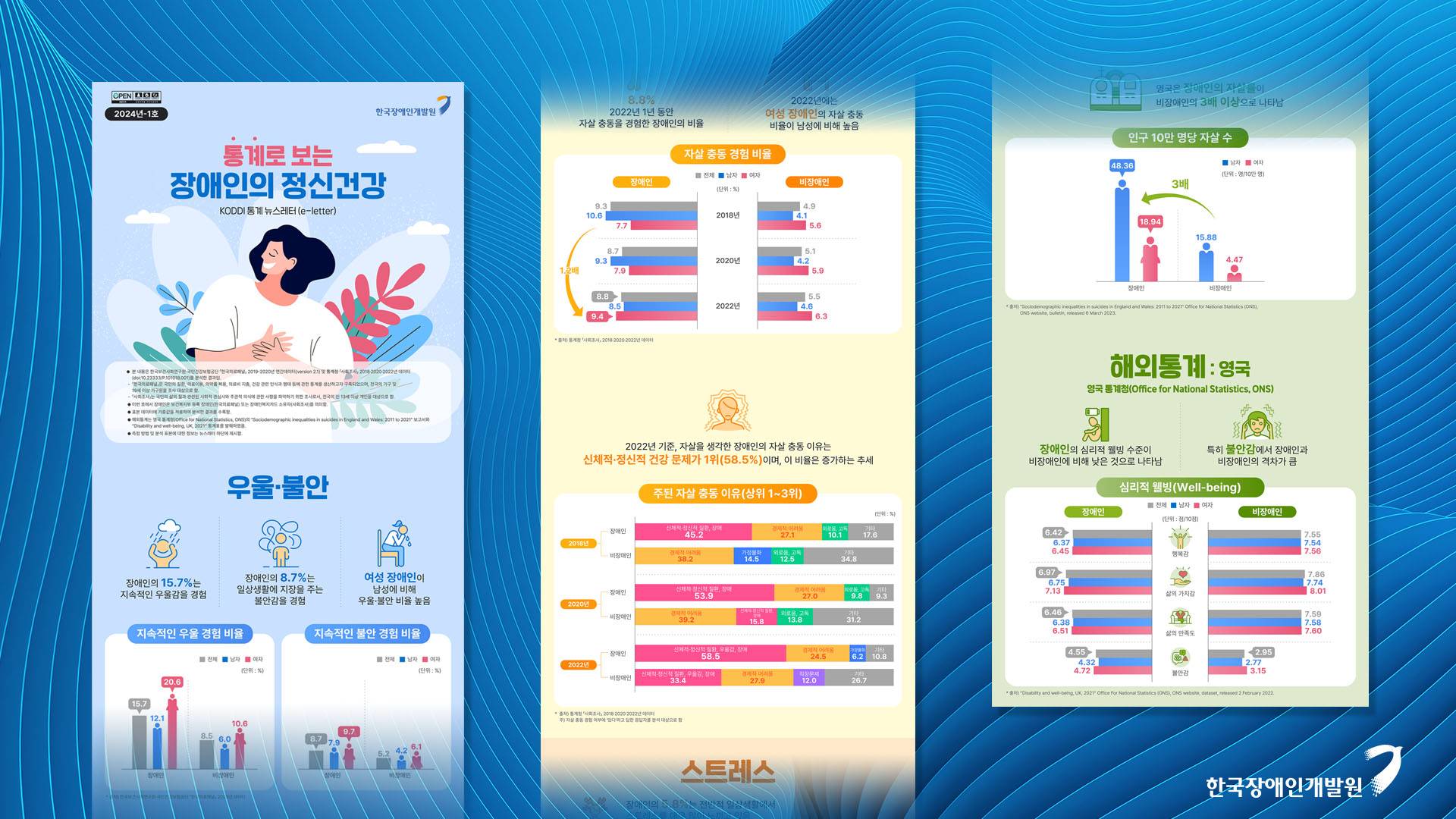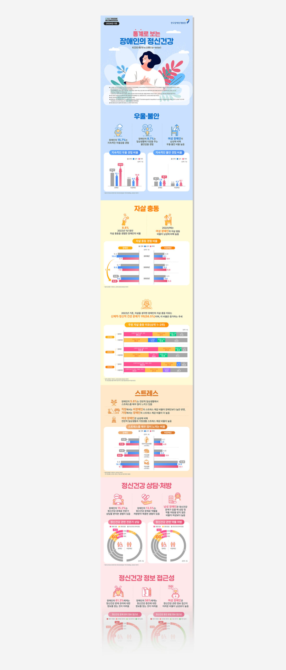 본 디자인은 2024년 수행하는 한국장애인개발원 인포그래픽 콘텐츠 시리즈의 1편 디자인입니다. 장애인에 대한 정신건강 통계 자료를 기초로 하여 일반인들이 이해하기 쉽게 다양한 정보의 표현기법을 사용하여 표현하였으며, 한국장애인개발원의 정체성을 디자인에 표현하였습니다.