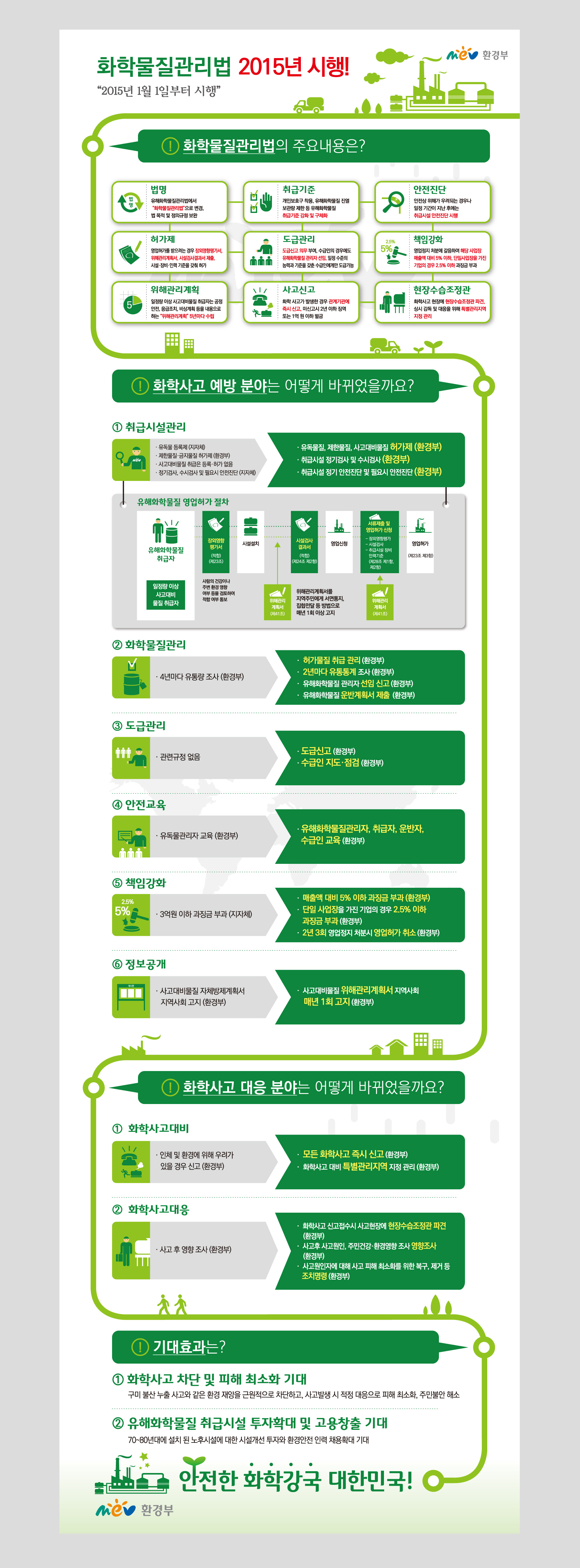 최근 발생한 화학물질 사고를 계기로 2015년 새롭게 시행되는 환경부의 화학물질 관리법을 주제로 한 인포그래픽입니다. 복잡하고 다양한 제도를 나열식 구성으로 표현하였습니다.