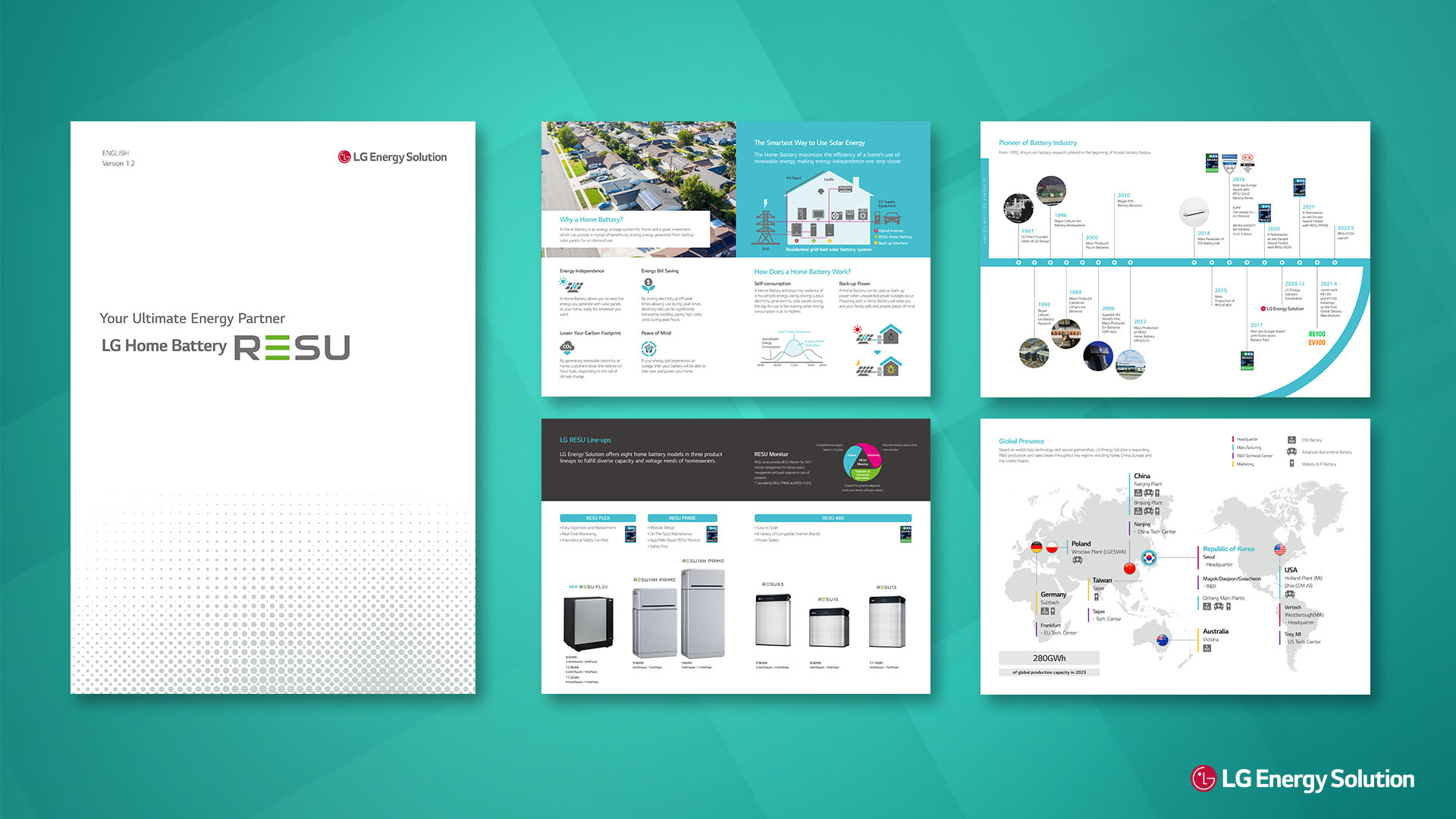 본 디자인은 RESU 제품군에 대한 다양한 정보를 담고 있는 인포그래픽 카탈로그 입니다. LG에너지솔루션의 역사와 위치, 제품군, 기술 등에 관한 다양한 정보를 담고 있으며, LG에너지솔루션의 정체성을 잘 나타내는 아이콘, 레이아웃으로 표현 하였습니다.