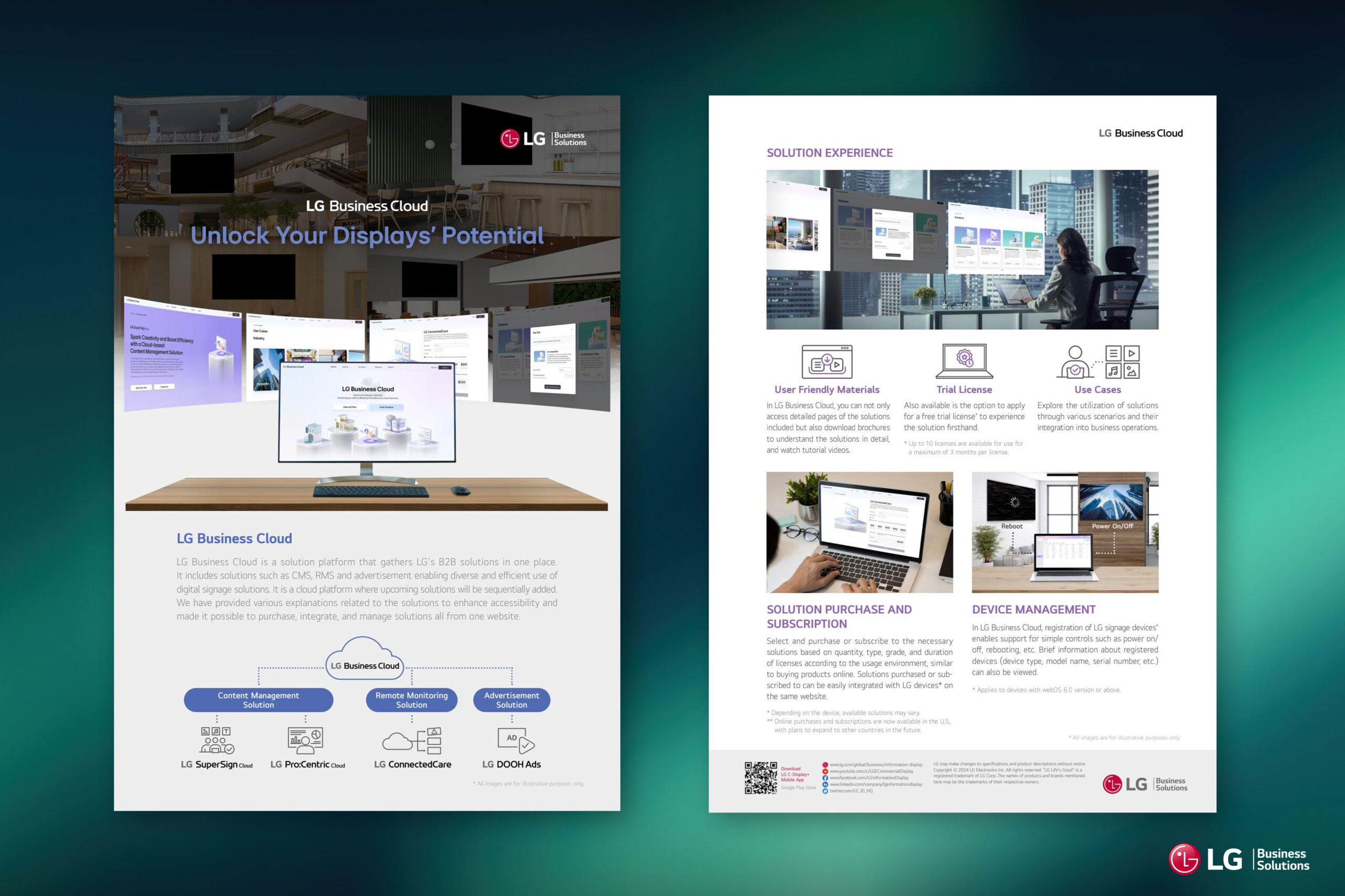 본 디자인은 다양한 디스플레이 전용 솔루션을 보유한 LG전자 B2B의 Business Cloud에 관한 마케팅을 위한 디자인입니다. 클라우드의 구체적인 정보를 알기쉽게 기술하였으며, 관련된 기능에 대한 요소들을 고품질 이미지 아트워크로 표현하였습니다.