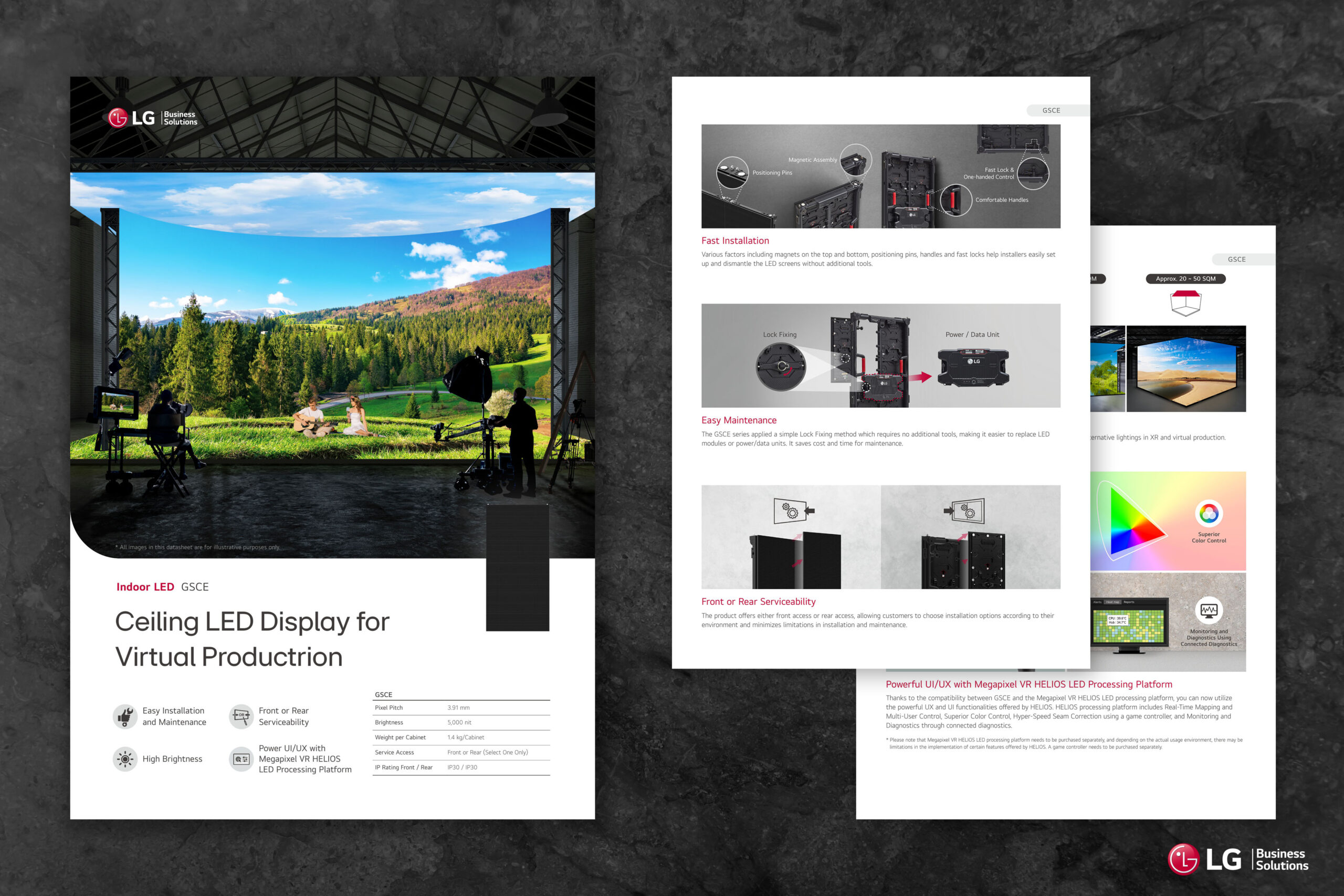 본 디자인은 LG전자 B2B에서 출시하는 GSCE 제품에 대한 데이터시트 콘텐트입니다. 다양한 방송촬영 환경에서 사용될 수 있는 제품의 특성과 환경에 대해 잘 나타내고 있으며, 새로운 LG B2B 콘텐트 가이드 라인을 기반으로 표현된 글로벌 향 마케팅 콘텐트 입니다.