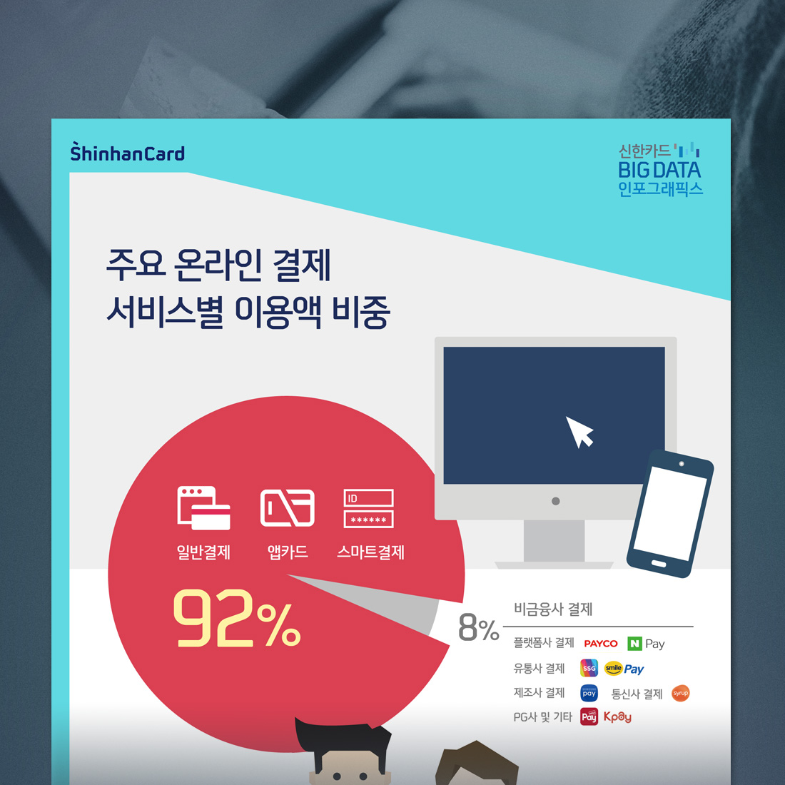 [vc_row][vc_column][vc_column_text]본 디자인은 온라인 결제 서비스별 이용액 비중에 관한 정보를 알기쉽게 표현한 인포그래픽입니다. 각각의 통계 데이터 수치를 강약표현으로 구성하였으며, 전체적인 디자인은 신한카드의 디자인 가이드라인에 준하여 디자인 하였습니다.[/vc_column_text][/vc_column][/vc_row]...