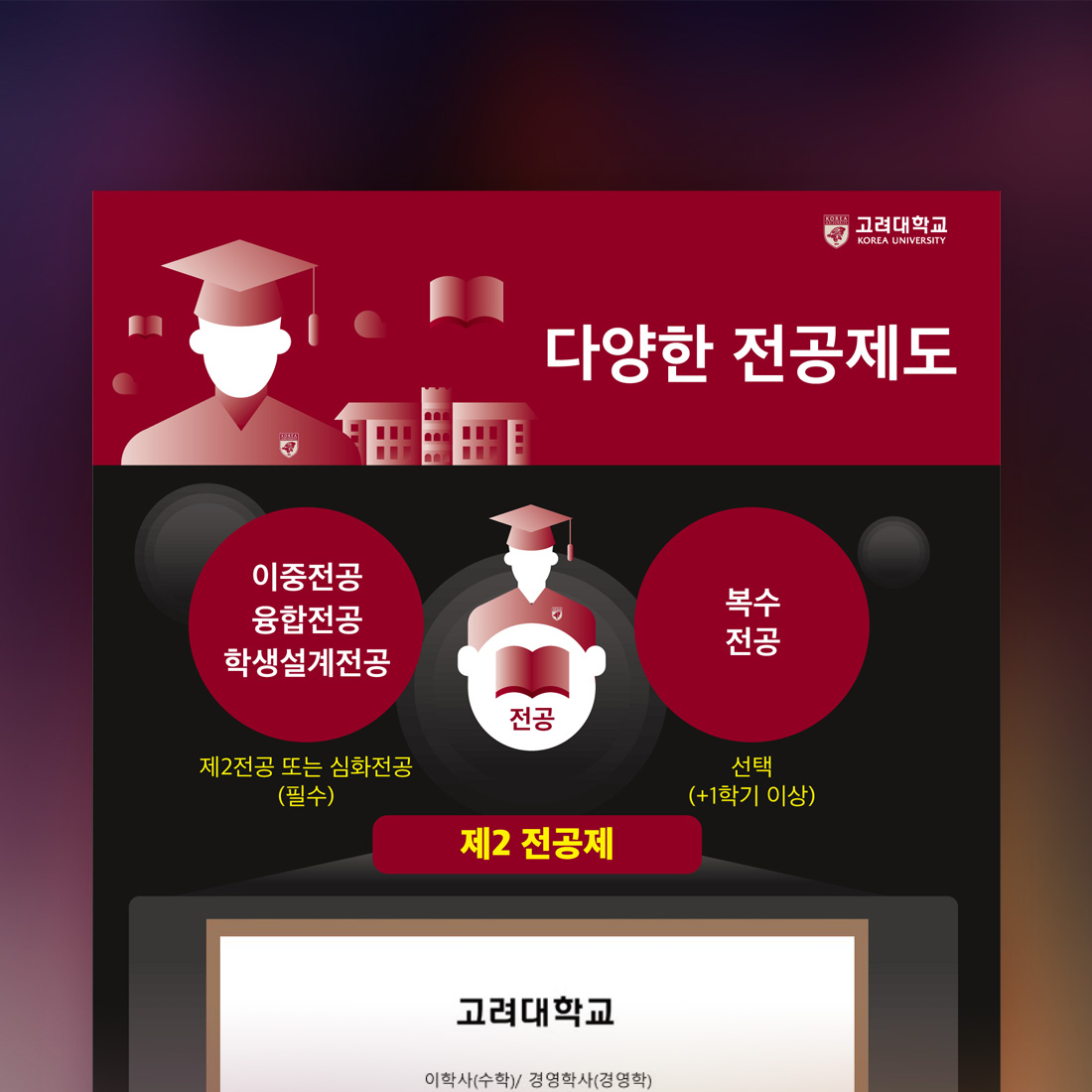 [vc_row][vc_column][vc_column_text] 본, 프로젝트는 고려대학교의 전공제도에 관한 인포그래픽으로, 복수전공 또는 이중전공의 어려운 정보를 알기쉽게 한눈에 표현하였습니다. 전체적인 디자인은 고려대의 권위와 아이덴티티에 걸맞는 절제된 디자인으로 표현하였습니다. [/vc_column_text][/vc_column][/vc_row]...